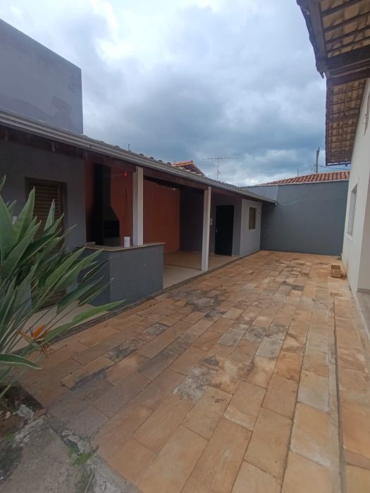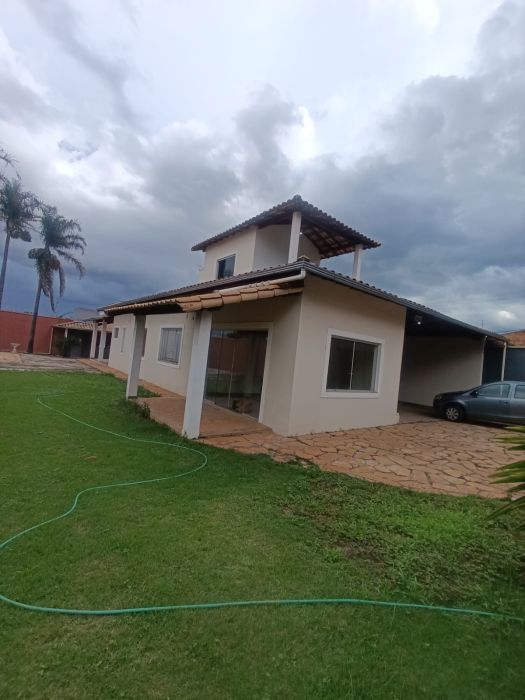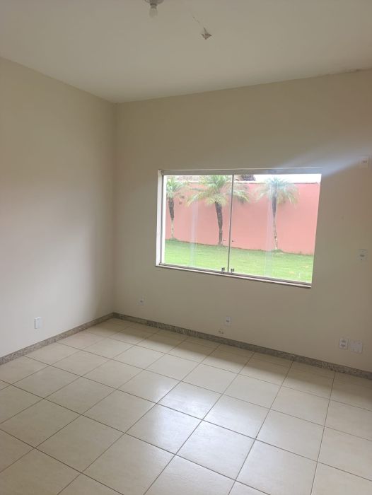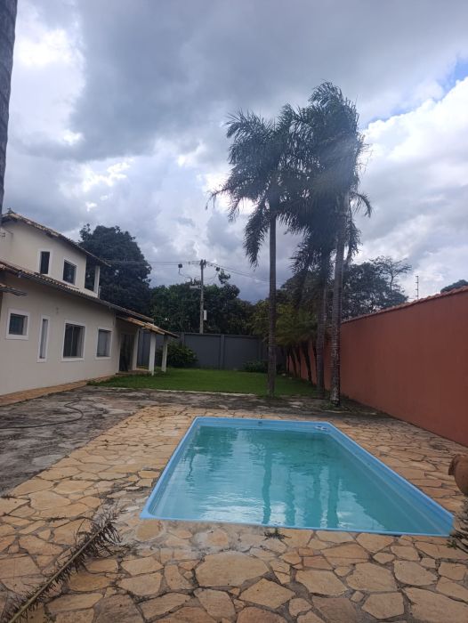 A estrutura interna dispõe de uma sala ampla e banheiros sociais, totalizando uma configuração robusta e bem dimensionada. Na área externa, o imóvel é equipado com piscina, um diferencial que agrega valor direto ao lazer e ao bem-estar, além de oferecer três vagas de garagem cobertas.